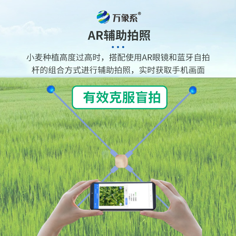 3、AR輔助拍照,有效克服盲拍:小麥種植高度過高時,搭配使用AR眼鏡和藍牙自拍桿的組合方式進行輔助拍照,實時獲取手機畫面。