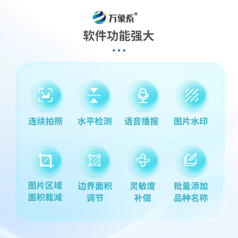 5、軟件功能強大:軟件具有連續拍照、水平檢測、語音播報、圖片水印、圖片區域面積裁減、遮擋率、邊界面積調節和靈敏度補償、批量添加品種名稱等功能。